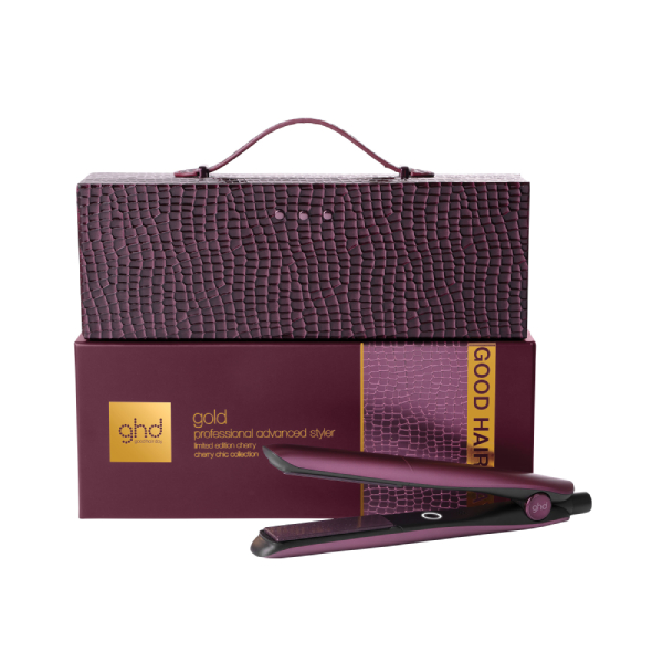 ghd Cherry Chic Collection Gold Hair Straightener in Cherry Red is where festive glamour meets professional performance. Wrapped in a deep, opulent cherry red and accompanied by a luxurious travel-inspired vanity case¹, this limited-edition styler elevates every styling session with timeless beauty and salon-quality results.