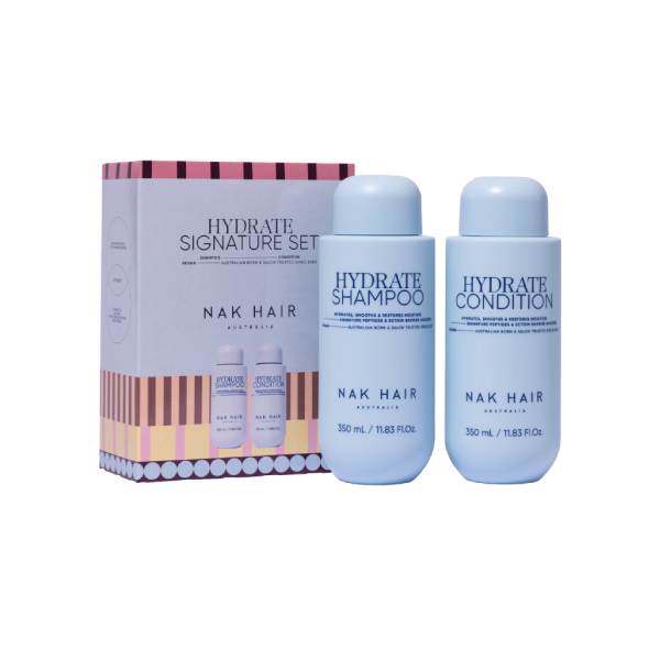 - NAK Hair HYDRATE Shampoo 350ml – A gentle yet hydrating cleanser that replenishes lost moisture, restores softness, and defends against dehydration while protecting colour vibrancy.