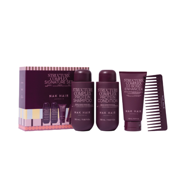 NAK Hair STRUCTURE COMPLEX Trio Gift Pack is a complete strengthening and repair system designed to rebuild fragile, damaged, or chemically treated hair. Featuring a protein-rich shampoo, conditioner, and the advanced No.3 Bond Enhancer, this pack restores strength, smoothness, and resilience while protecting hair fibres from future stress. Complete with a bonus signature comb for effortless detangling and even product distribution.